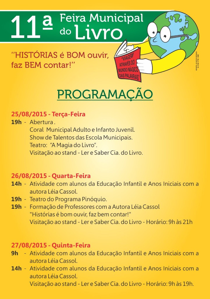 Durante a programação da 11ª edição da Feira do Livro, também serão realizadas apresentações teatrais e visitações ao Stand Ler e Saber da Cia do Livro. Incentive seu filho a participar e desperte nele o gosto pelo mundo mágico da literatura.