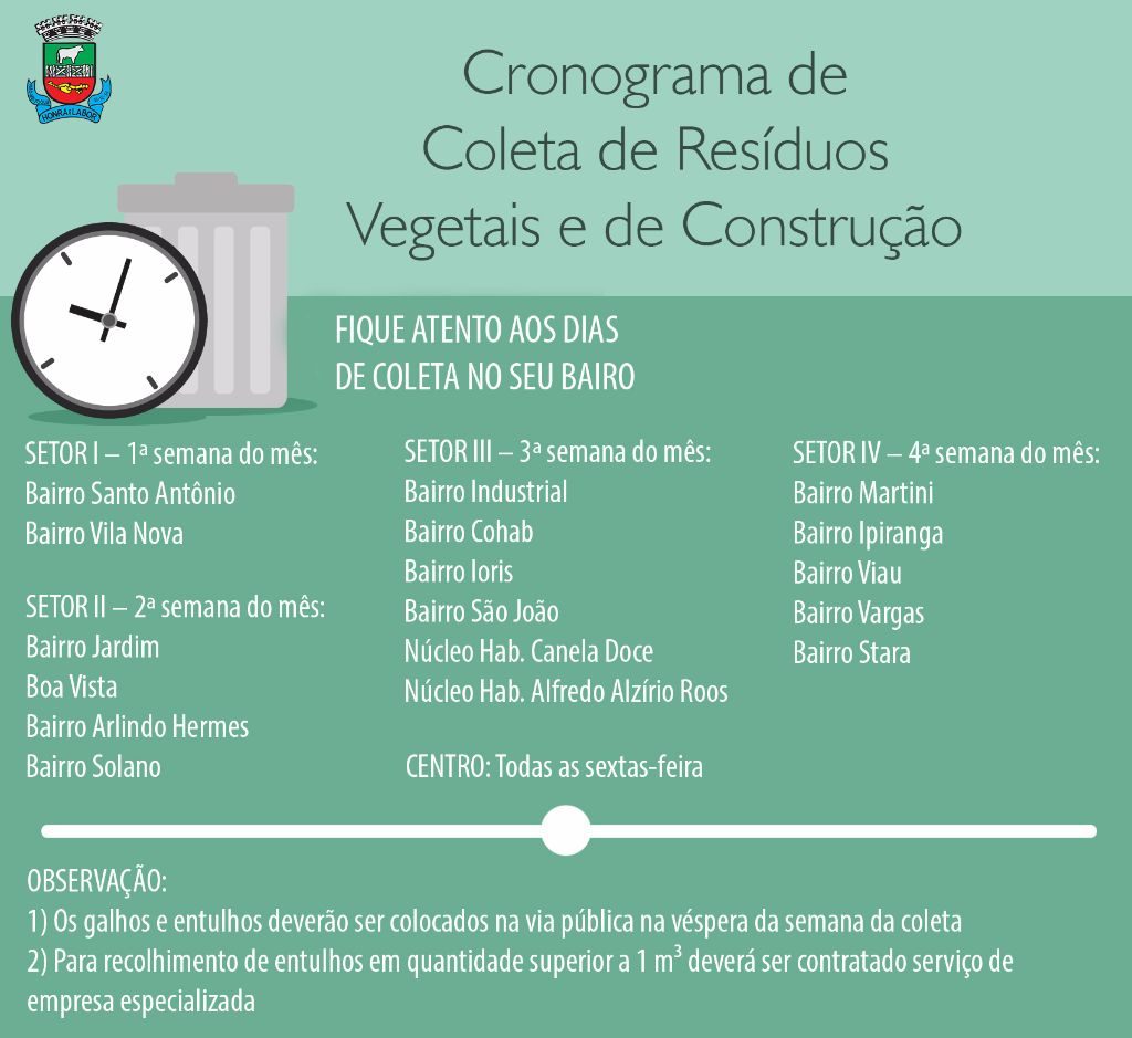 Abaixo o cronograma dos serviços de coleta e transporte dos resíduos vegetais e resíduos de construção civil no perímetro urbano do município de Não-Me-Toque: