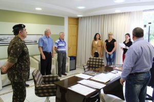 Na quarta-feira (07), o Prefeito Pedro Paulo Falcão da Rosa foi empossado Presidente da Junta de Serviço Militar de Não-Me-Toque pelo Delegado da PRM 03/002 Ledinei Lequiça Velaz. A Secretária da Junta de Serviço Militar Magnólia Mallmann esteve acompanhando juntamente com demais Secretários na breve solenidade realizada no Gabinete do Prefeito.