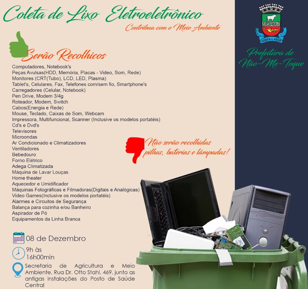 A empresa responsável pelo recolhimento do material é a Natusomos de Horizontina, lembrando que não serão recolhidas Lâmpadas, Pilhas, Baterias e Tonners, somente eletroeletrônicos!