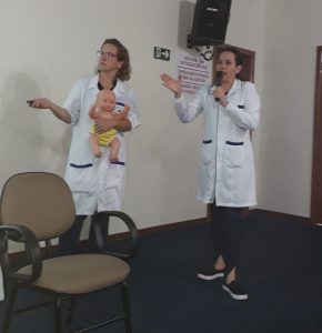 A enfermeira Renata Kraemer e a Técnica de Enfermagem Daniela Zanon demonstraram aos professores como agir diante das mais variadas situações.