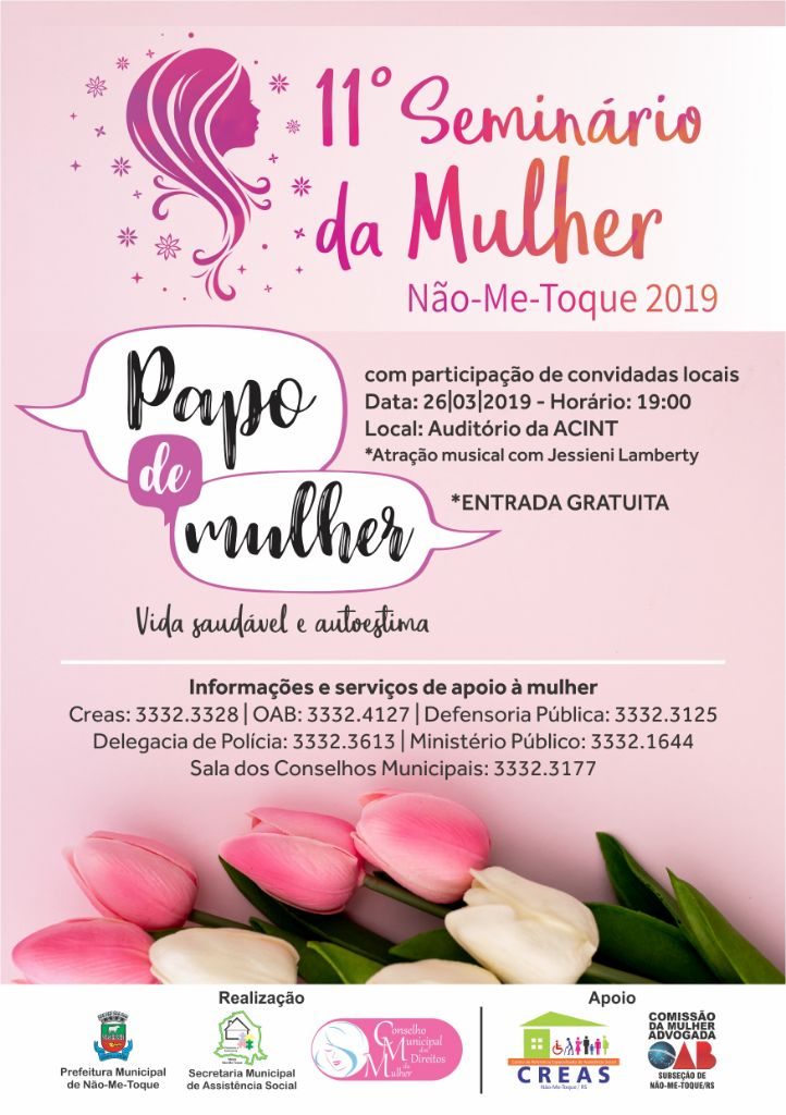 Pensando nisso, há dez anos a Administração Municipal de Não-Me-Toque através da Secretaria de Assistência Social e o Conselho Municipal dos Direitos da Mulher promovem o Seminário da Mulher que neste ano acontece dia 26 de março, na ACINT, início às 19h.