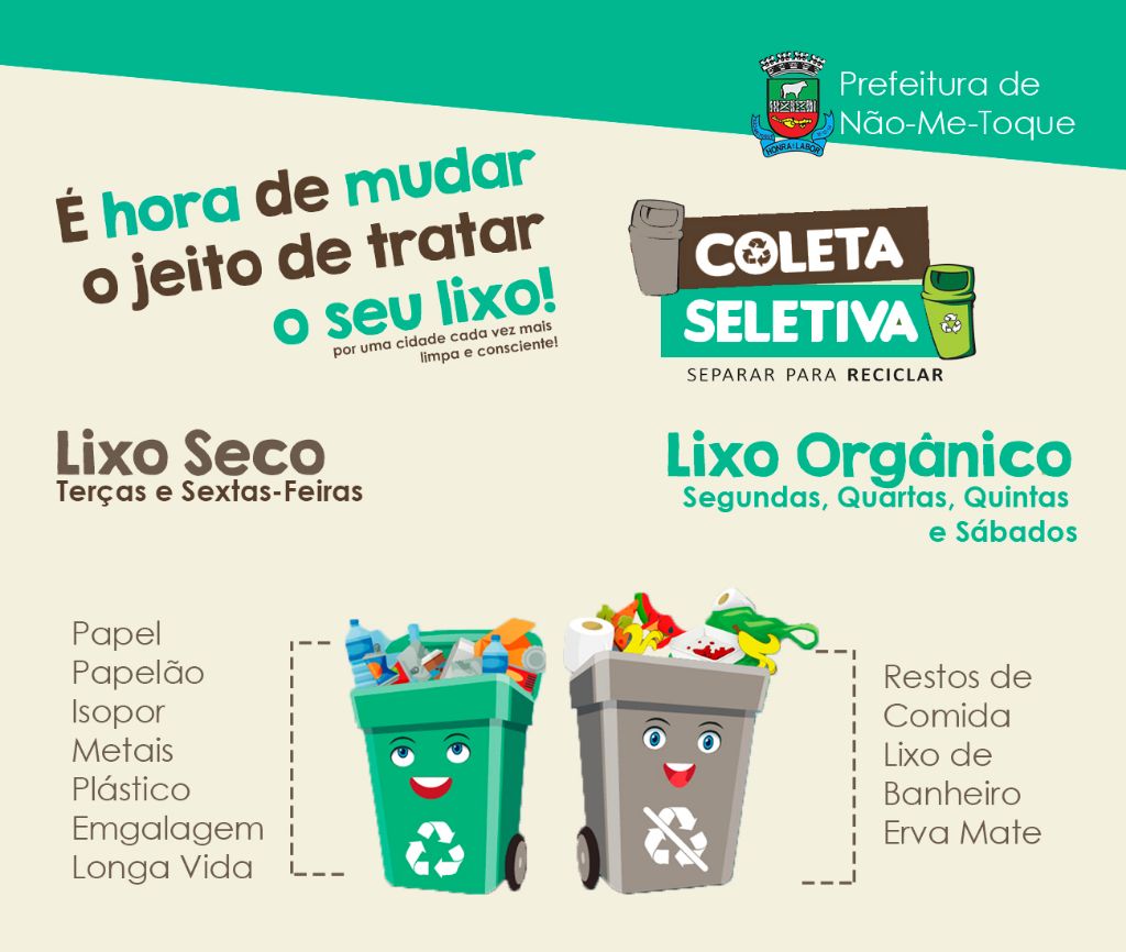 A partir de Outubro, o recolhimento de Lixo em Não-Me-Toque passará a ser feito através da Coleta Seletiva. Além de diminuir a exploração de recursos naturais renováveis e não-renováveis e melhor a limpeza da cidade e da qualidade de vida da população, a Coleta Seletiva de Lixo diminui a proliferação de doenças, a contaminação dos alimentos e dos custos de produção pelas indústrias que reaproveitam o material reciclável.