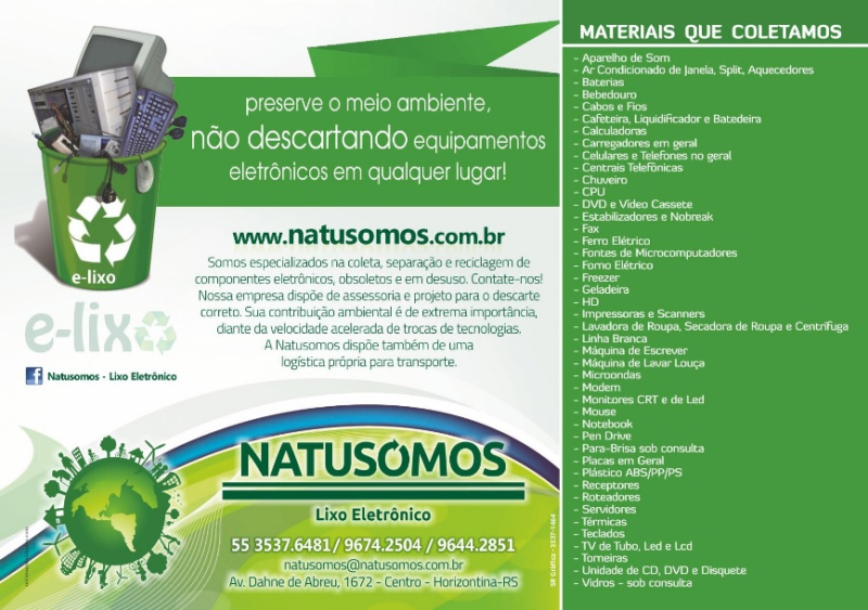 Este ano devido a questão da pandemia, o local da campanha será alterado para um local mais reservado, visando restringir a aglomeração de pessoas alheias ao trabalho da coleta, portanto, foi escolhido as instalações do campo do Esporte Clube Colorado. A empresa responsável pelo recolhimento do material é a Natusomos de Horizontina, lembrando que não serão recolhidas Lâmpadas, Pilhas, Baterias e Tonners, somente eletroeletrônicos!