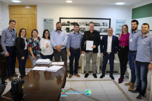 A assinatura da ordem de serviço da terraplanagem do Loteamento Nova Morada localizado na Rua Mário Quintana, Bairro Alfredo Alzírio Roos ocorreu no gabinete do Prefeito Municipal Gilson dos Santos – Maninho com a presença de Vereadores e Secretários Municipais.